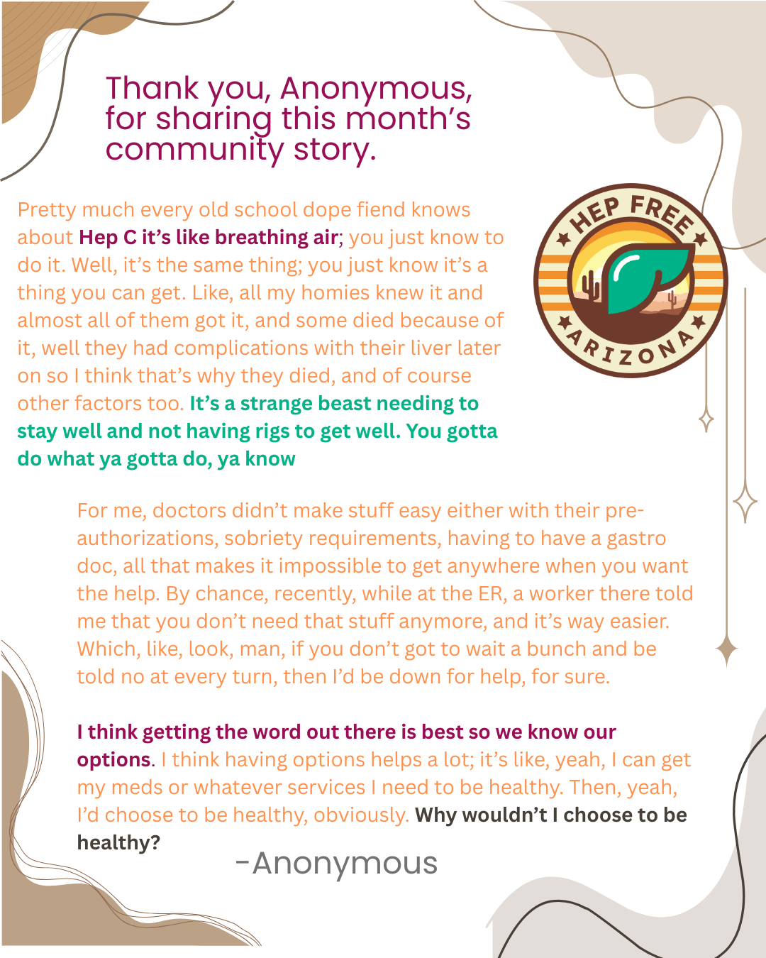 As we recognize Hepatitis Awareness Month, it’s important to remember that behind every data point is a real person navigating the complexities of diagnosis, treatment, and, for many, stigma. Raising awareness is not only about sharing facts—it’s also about elevating the voices of those who have lived through the challenges and triumphs that come with hepatitis. Their experiences offer invaluable insight into the human side of this public health issue, helping to build empathy, reduce stigma, and inspire action. We invite you to take a moment to read a few powerful stories from individuals who have generously shared their journeys. A special thanks goes out to Southwest Recovery Alliance for helping to coordinate and compensate individuals for their stories.